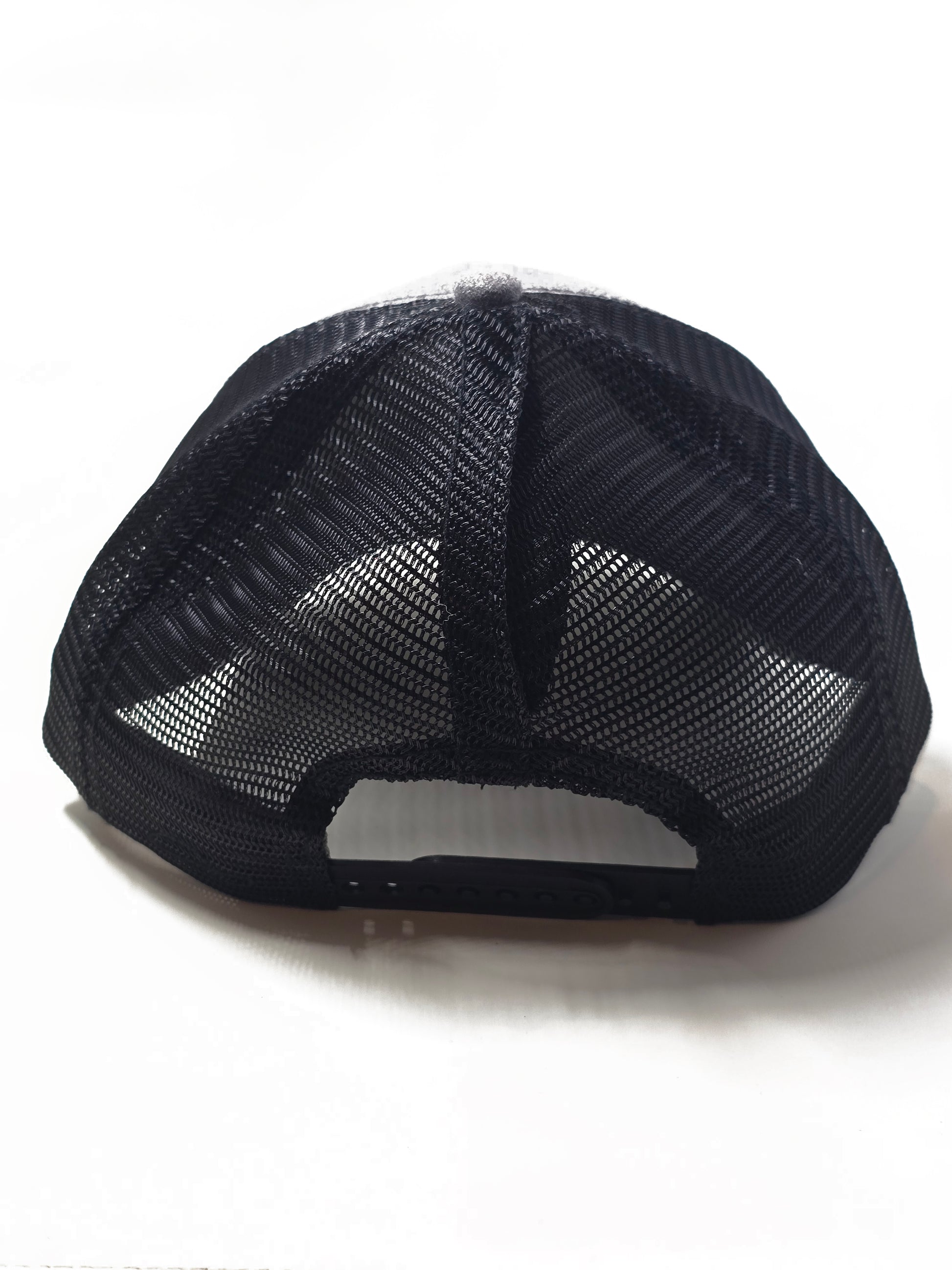 -Materials: Cotton/poly front, mesh back, faux leatherette patch