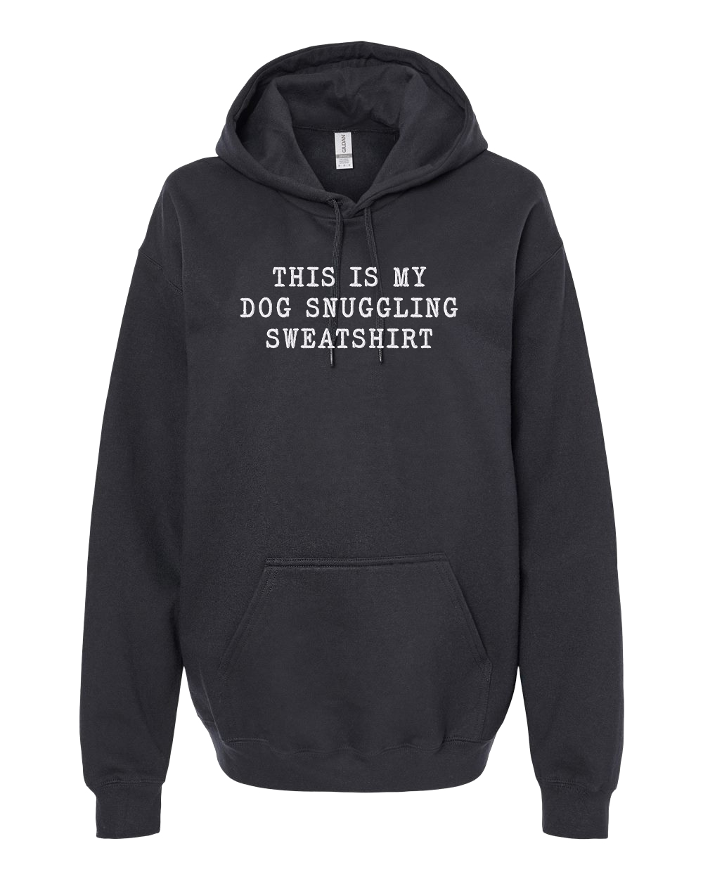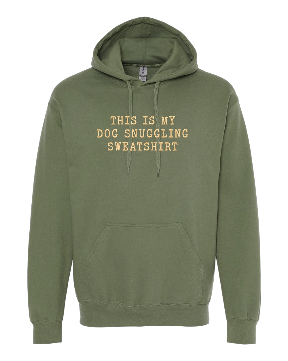 This cozy sweatshirt is perfect for dog snuggles. Embroidered with “This Is My Dog Snuggling Sweatshirt” is available in Military Green (tan thread), Black (white thread), and Sport Gray (black thread). Unisex fit. Handmade in Minnesota.