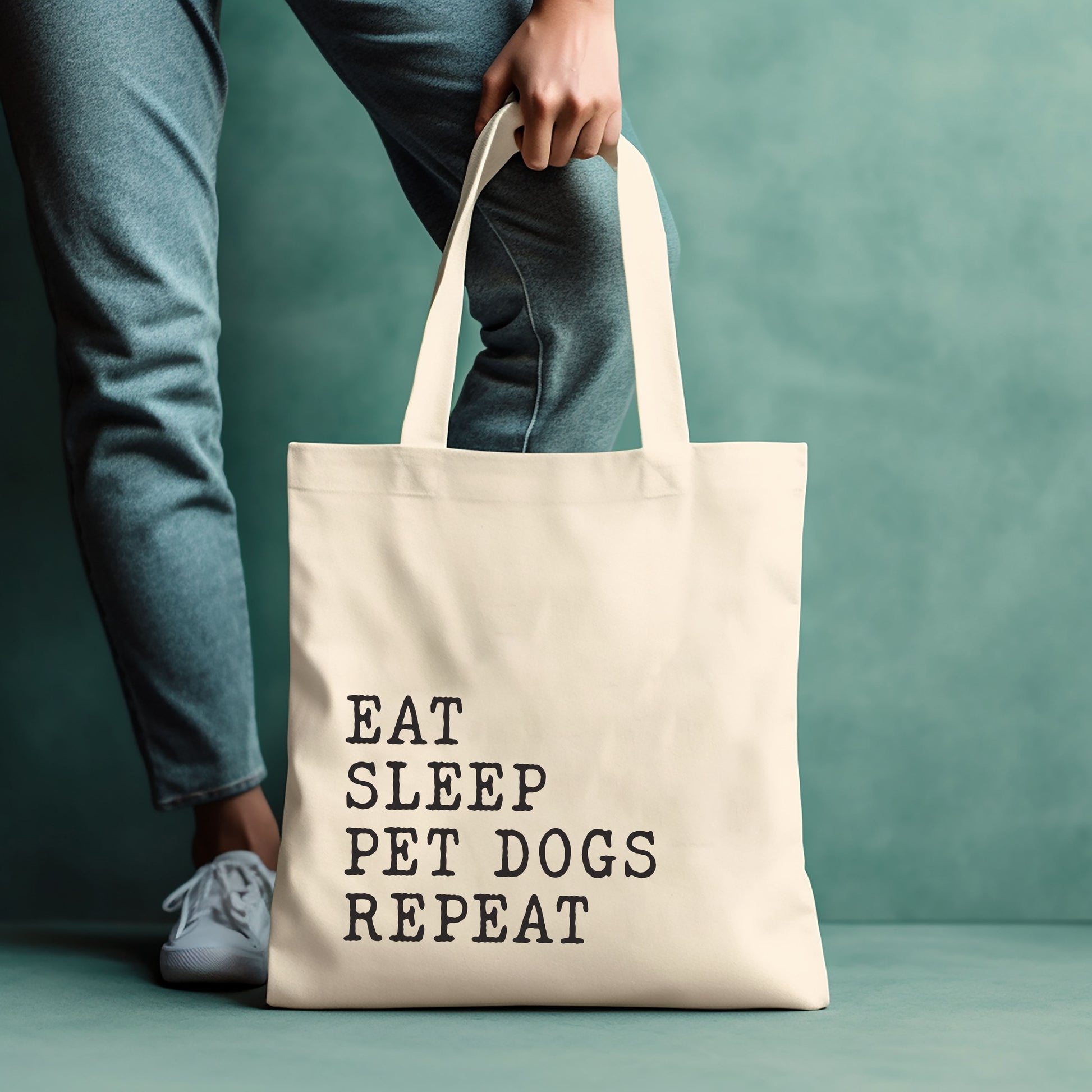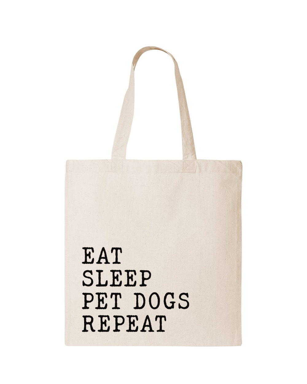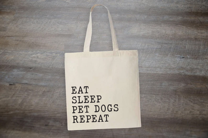 Showcase your passion for pups with this adorable and practical tote bag. The statement "Eat Sleep Pet Dogs Repeat" captures the heart of every dog owner's daily routine - enjoying the company of our furry companions every step of the way.