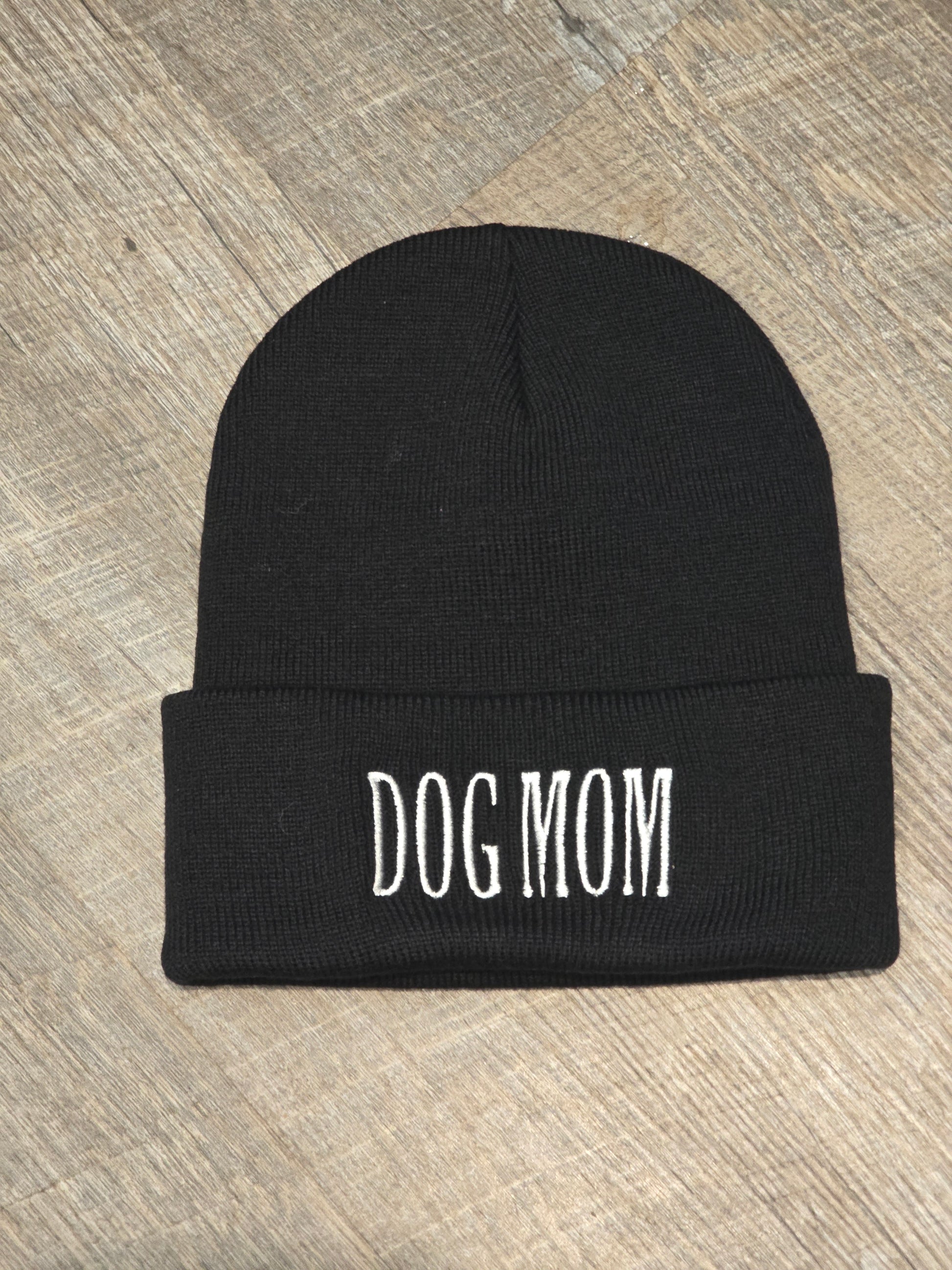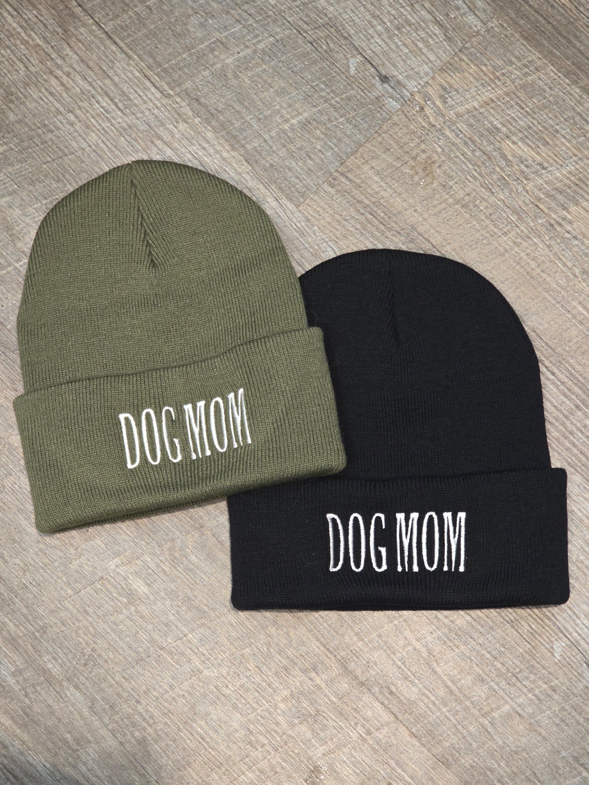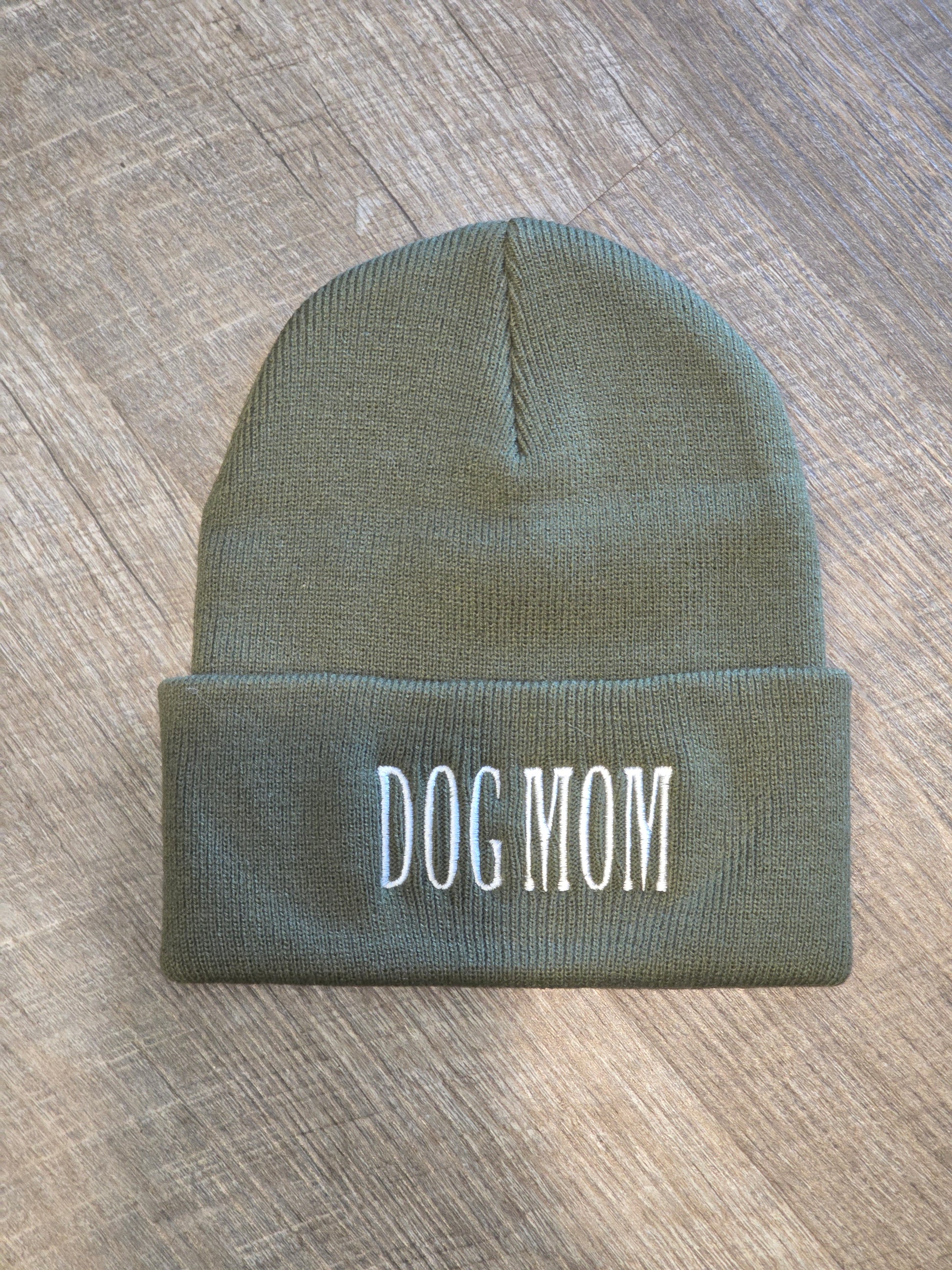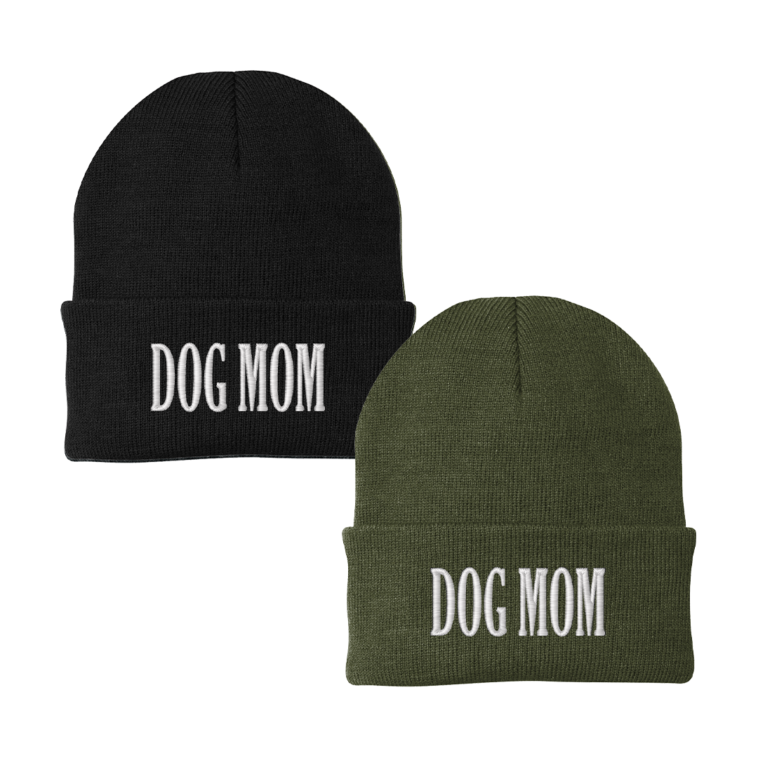 Embroidered Dog Mom Beanie in Black or Military Green Knit Hat