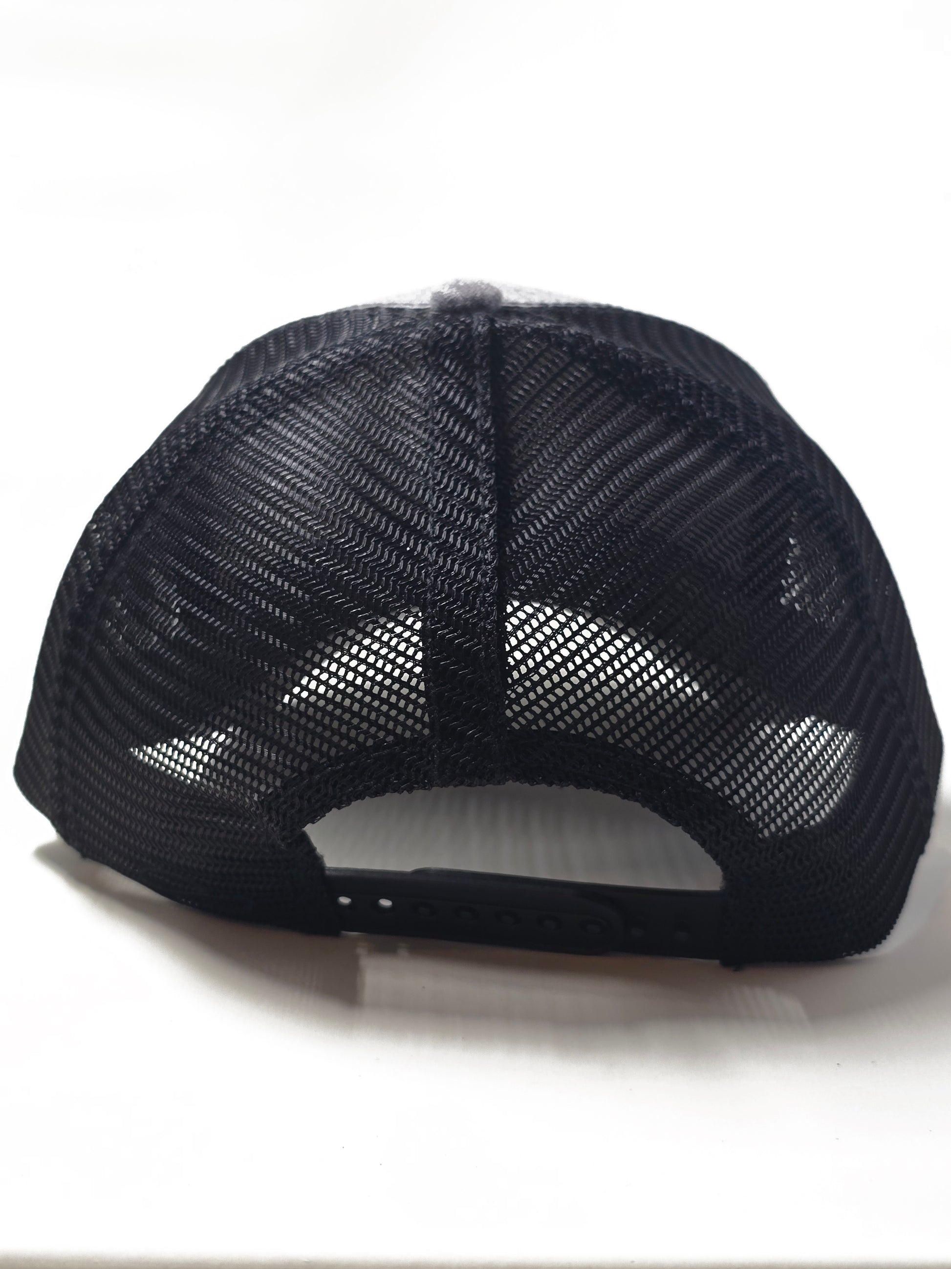 -Materials: Cotton/poly front, mesh back, faux leatherette patch
