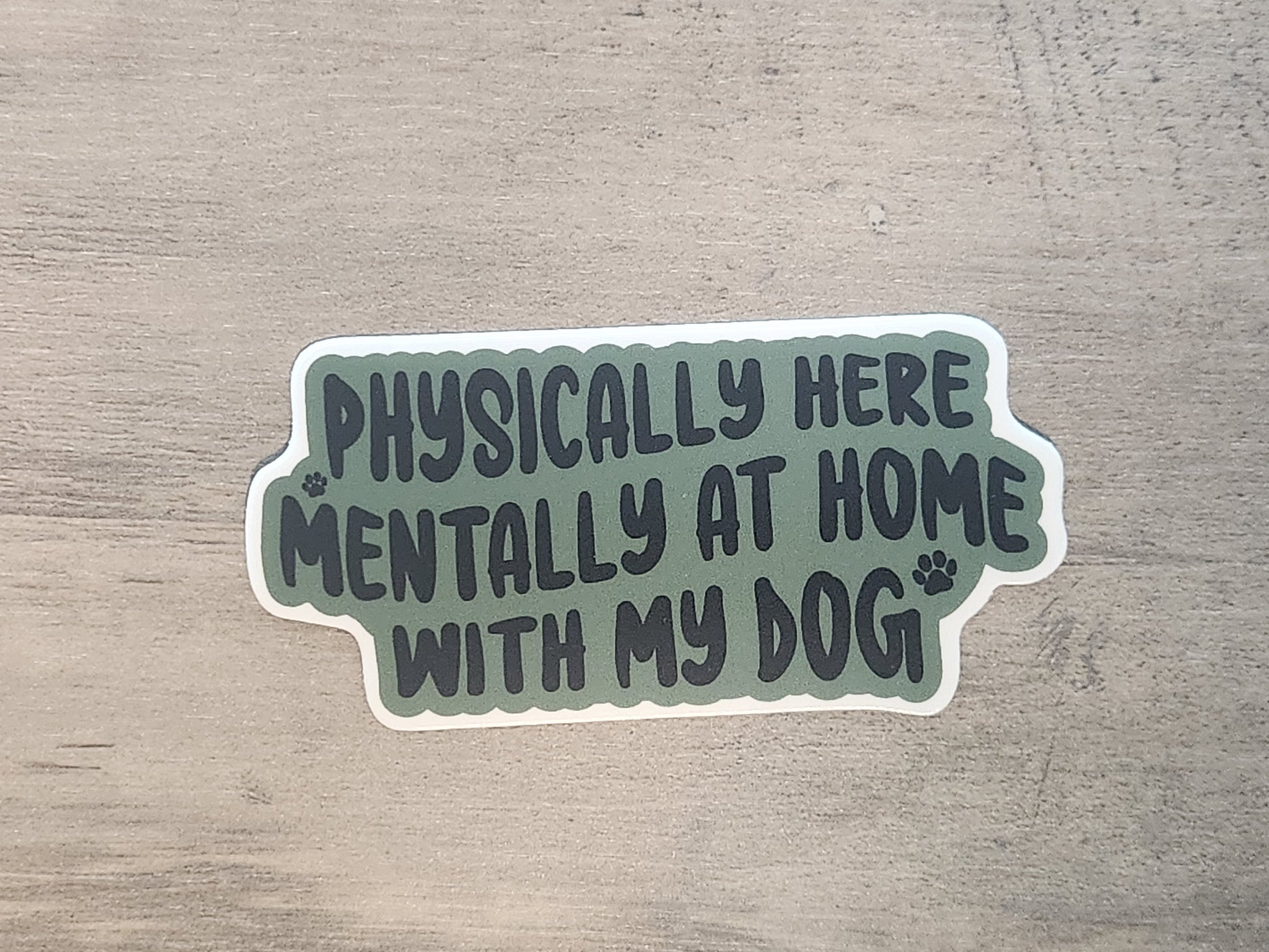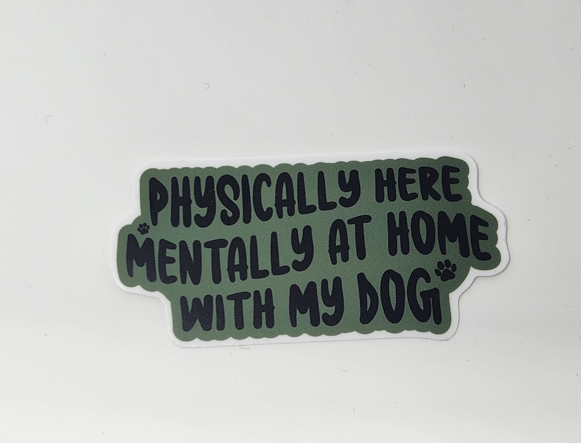 Express your love for canine companionship with our 'Physically Here, Mentally at Home with My Dog' sticker. Perfect for dog lovers who find solace and joy in the comforting presence of their furry friends. Stick it proudly and let the world know where your heart truly belongs.