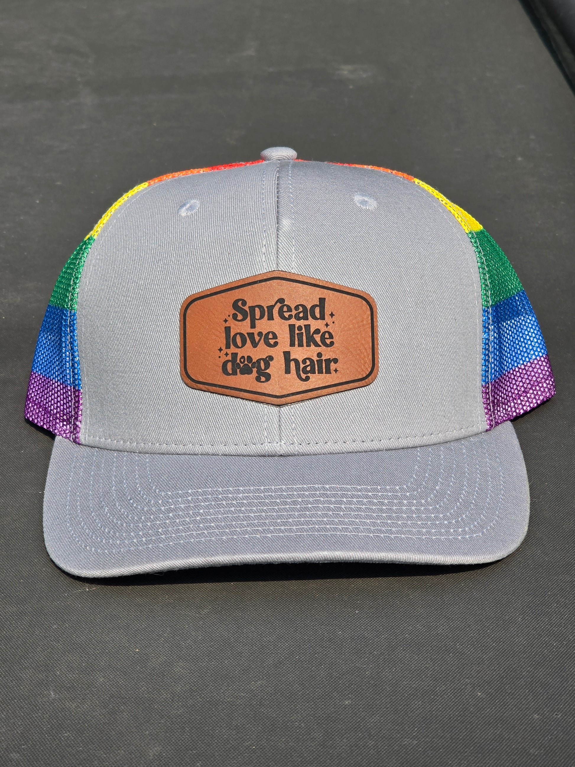 Celebrate love, pride, and your favorite furry friend with this rainbow mesh trucker hat featuring a “Spread Love Like Dog Hair” leatherette patch. Designed for dog moms, dads, and LGBTQ+ pet lovers, it’s the perfect blend of bold color, casual fit, and playful personality. Wear it for festivals, errands, or dog park hangs — and let your hat do the smiling.