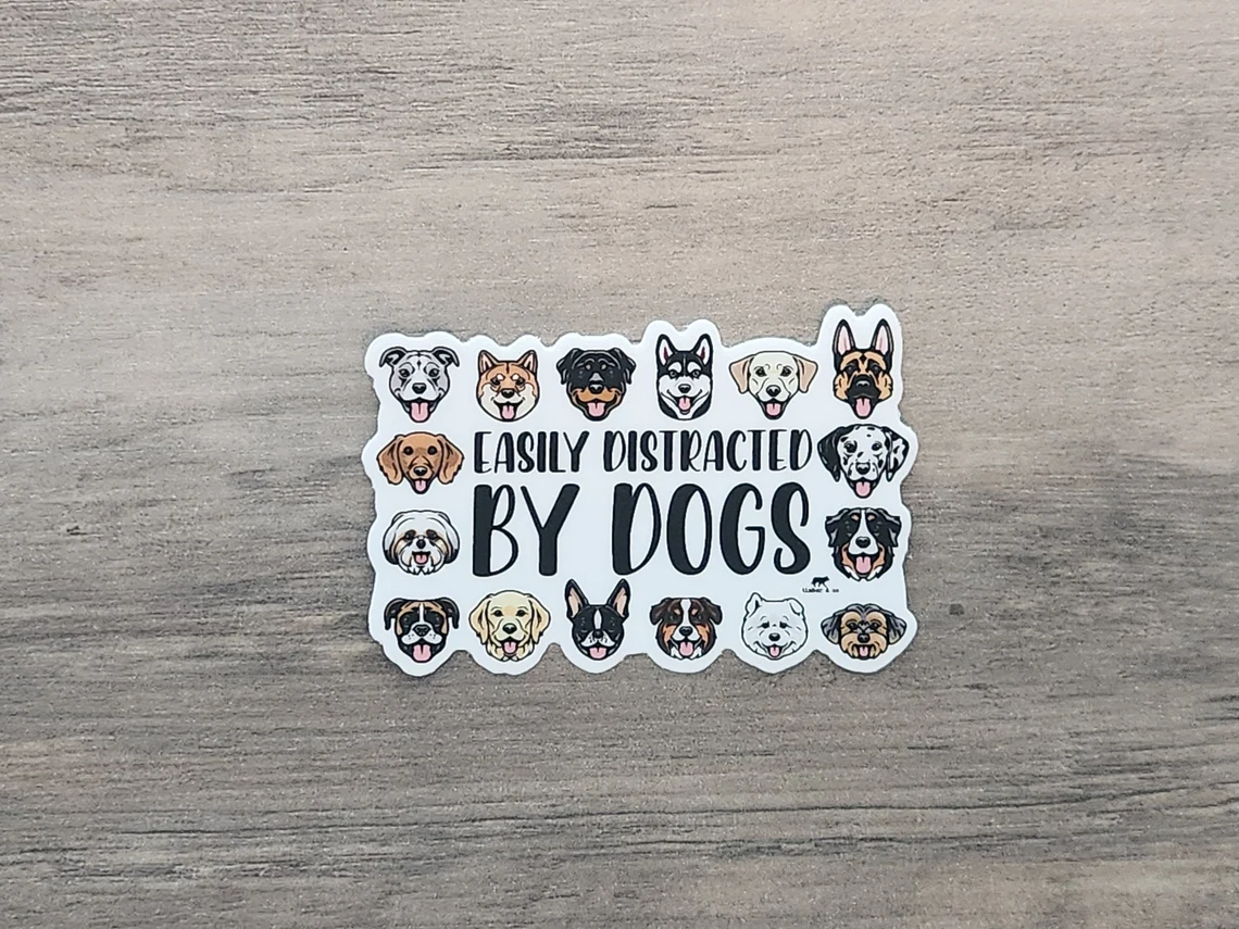 Express your love for your furry friends with our 'Easily Distracted by Dogs' sticker! Perfect for dog enthusiasts who embrace the joy and humor of being a devoted dog parent. Stick it proudly and share your passion for the paws in your life!
